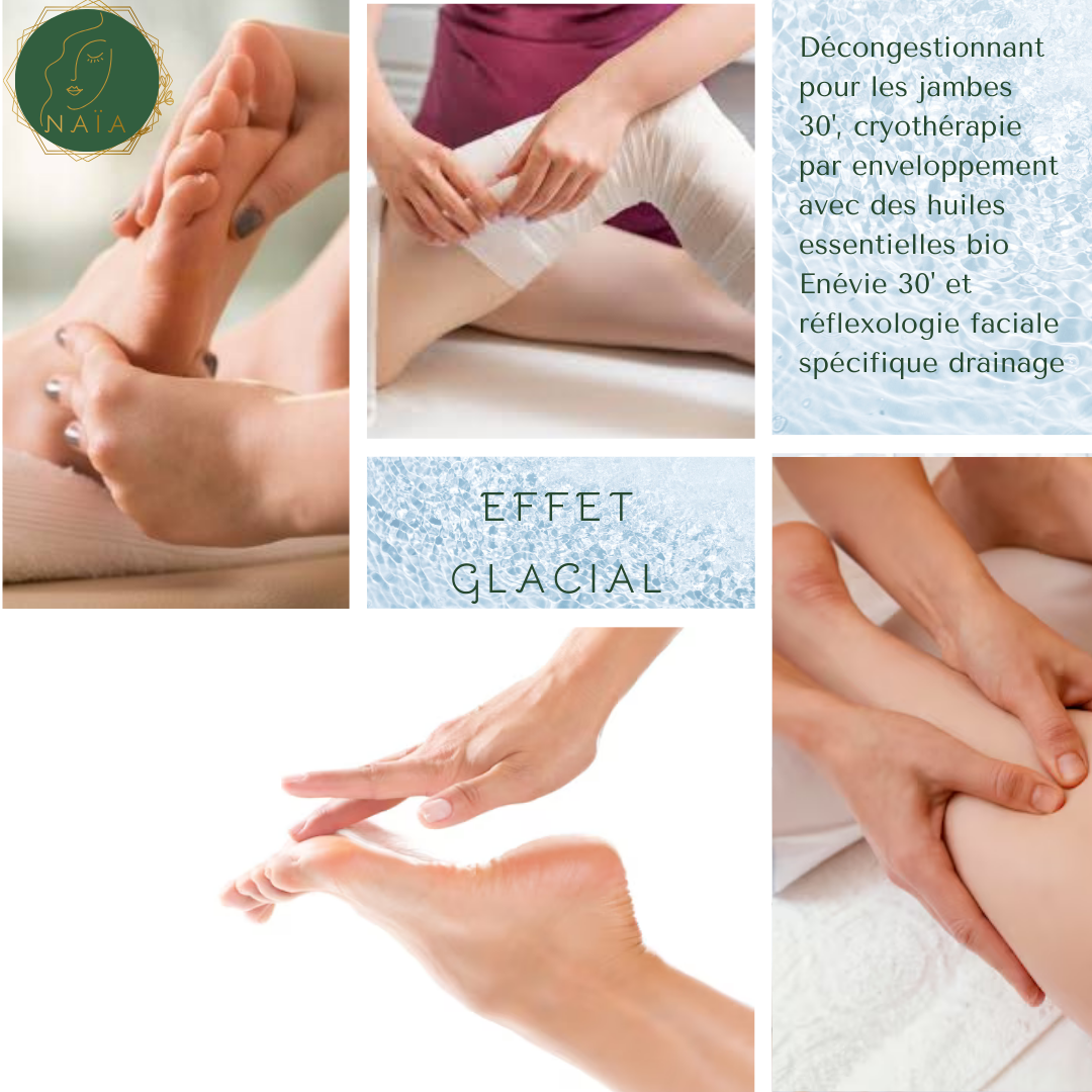 - Ensuite on enveloppe vos jambes dans de fines bandelettes de crêpe imbibées de lotion cryo durant 30mn, en remontant jusqu’au-dessus des genoux. Cette lotion “effet glaçon” se compose de plantes et d’huiles essentielles aux vertus rafraîchissantes et décongestionnantes naturelles. Pendant la pause des bandes je vous propose une séance de réflexologie faciale pour favoriser la circulation sanguine et diminuer les sensations de jambes lourdes en stimulant les points réflexes adaptés. Vous repartirez avec un fiche détaillé pour pouvoir vous stimuler les points réflexes sur votre visage chez vous.